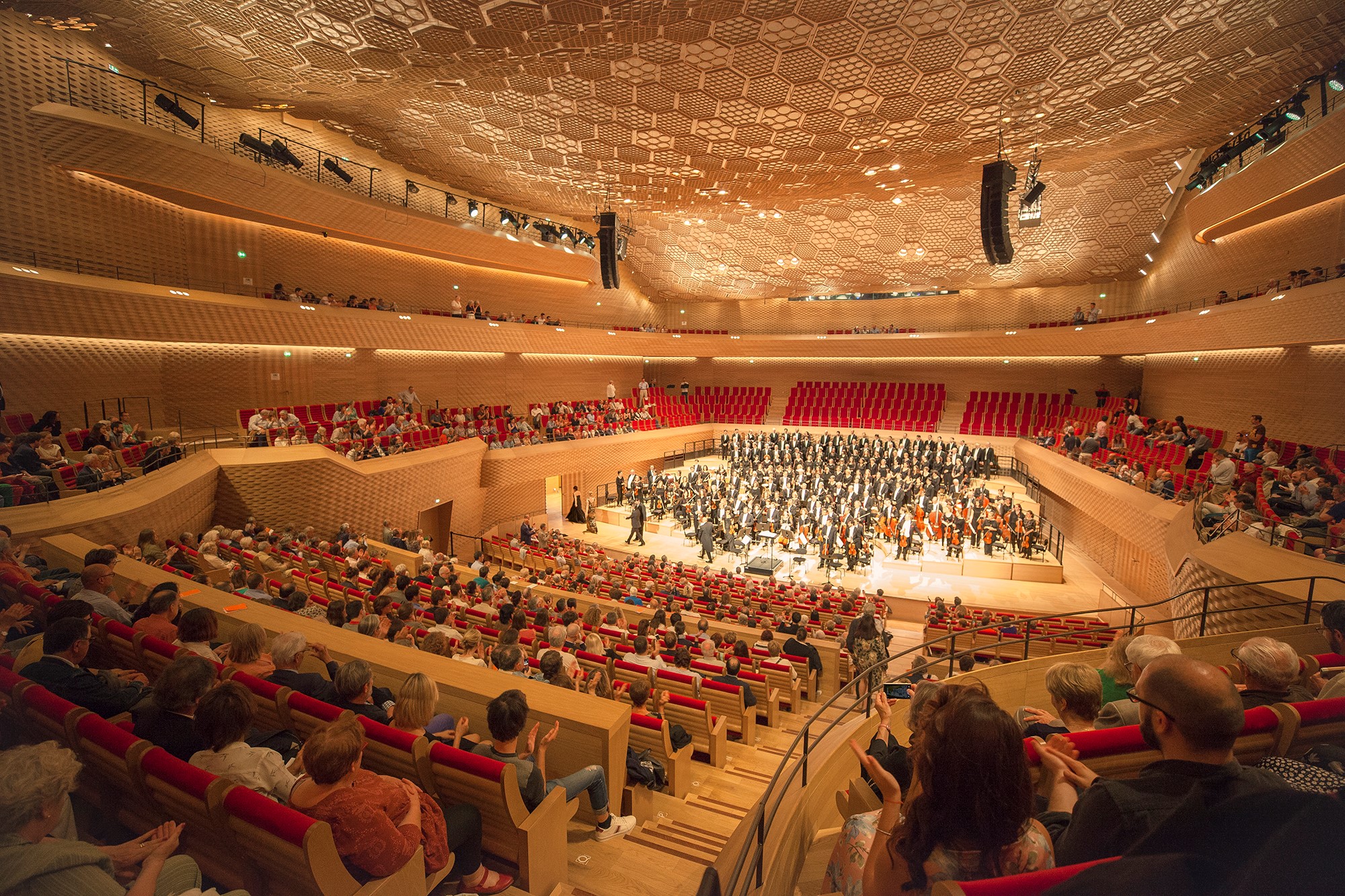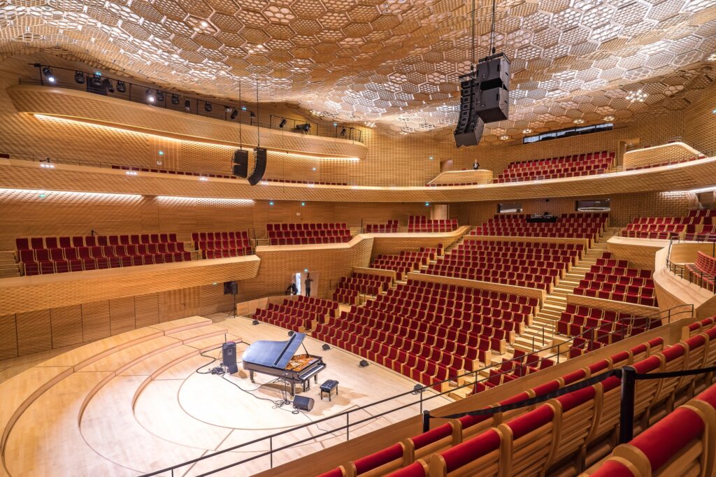 De l’intérieur, la salle de 1 150 places éveille nos sens. Dédiée aux concerts de musique classique, jazz et musiques du monde, son plafond en bois blond, tubes de cartons et papier révèle tous les secrets de l’excellent acoustique de cette scène.