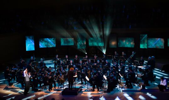 Des tirages papiers exposés à l’intérieur du bâtiment, tandis qu’une vidéo interactive est diffusée sur l’écran géant sur le parvis. Un film rythmé par la musique, originale, d’Ibrahim Maalouf et son orchestre Free Spirit Ensemble.