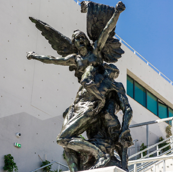 La sculpture orne l’escalier monumental qui mène au jardin Bellini. Cette statue de bronze représente une femme ailée, les bras levés et les poings serrés, symbole de la défense de Paris en 1870 lors de l’invasion prussienne. Elle soutient un soldat blessé. En 1879, Rodin avait présenté le projet de cette œuvre au concours du Département de la Seine.